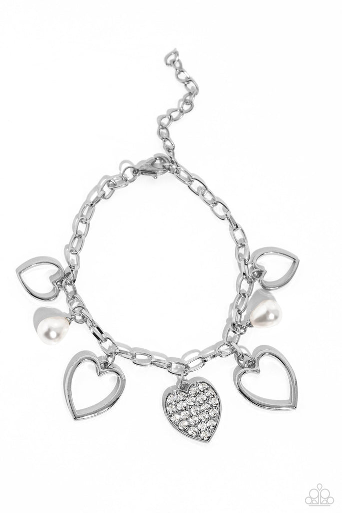 Glistening silver heart silhouettes, white potato pearls, and a white rhinestone-encrusted silver heart frame dangle from a classic silver chain link around the wrist, resulting in a romantic fringe. Features an adjustable clasp closure.